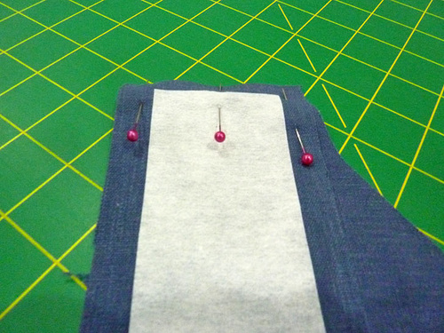 - Place the interfacing on the wrong side of one of the fabric panels, centering it so there is ¼” of fabric showing to either side and ½” of fabric showing top and bottom.