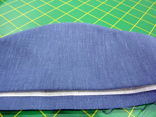 - Open up the accent band and place just the raw edge of the facing (the non-folded, interfaced side) right sides together with the top raw edge of the lining – right side of the accent band is against the right side of the lining.