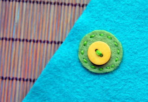 - Sew the button backing circle to the outside of the case (opposite or where you just stitched the bow tie) then attach button using the pea green floss (be sure to double check alignment with the button tab, allowing about ⅛” extra for the thickness of the interior pieces).