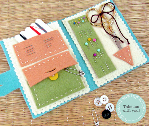 - Add an assortment of buttons, safety pins, and perhaps a needle threader to the pocket. You can insert a variety of needle sizes through the thread pocket. Put some straight pins in the pin flap, and you’re done.