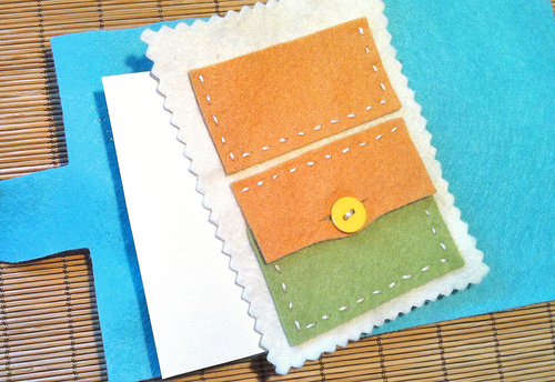 - Cut all of your pieces from the appropriate colors of felt, using the above images as a guide or picking your own combination. We used our pinking shears to pink the inside vanilla backing panels, but that’s optional.
