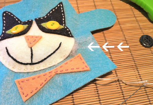 - Sew the kitty face to the outside of the case using vanilla floss (use the pattern as a placement guide), going all the way around the head. About an inch from completion, leave a gap as shown below below one ear. Lightly stuff the kitty face with polyester fiber fill to form a pin cushion. Once stuffed, finish sewing the face to the case.