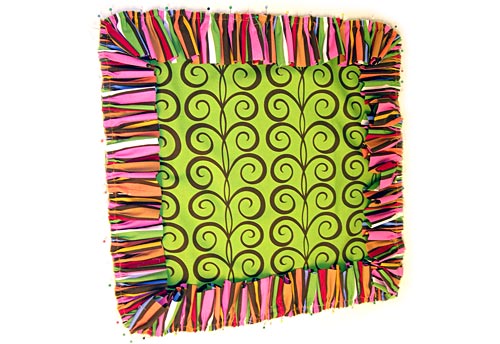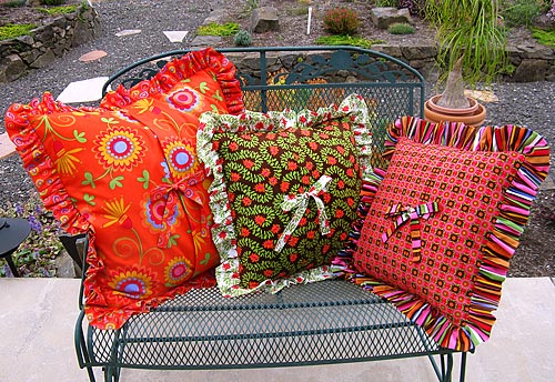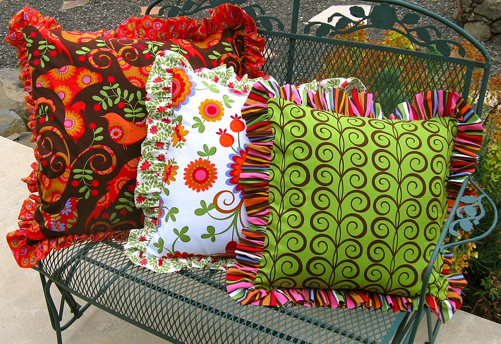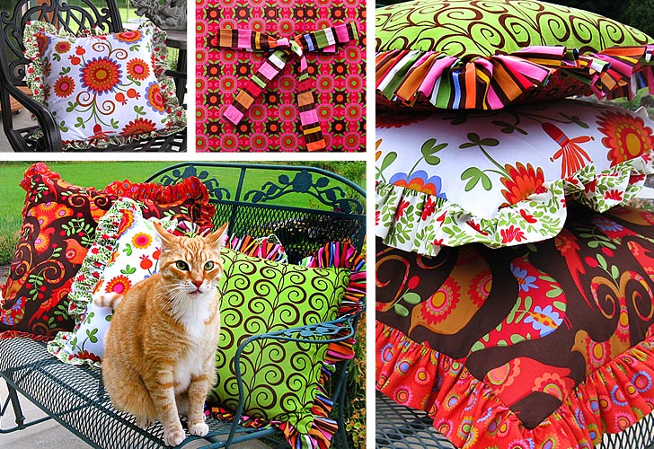 Mix and match! That’s what these big, fun pillows are all about. One fabric on the front, another on the back, a third for the ruffles and ties. Put them all together for a cornucopia of color. We’ve blended some great greens, oranges and browns to create an updated take on the late ’60s – early ’70s mod palette. With a cute bow closure on the back, this set of 18″, 20″ and 24″ pillows looks great from either side. Plop them against a plain sofa and watch the room go from boring to beautiful in the blink of an eye.