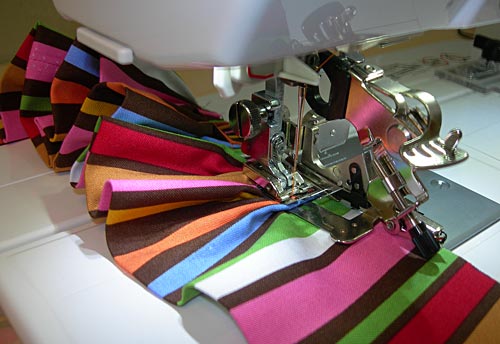 NOTE: This is a LOT o’ ruffling. So, we opted to use the a ruffler attachment for our Janome machine. These puppies look intimidating but are easy to use; check out our good video tutorial on their Ultimate Ruffler, which works on the majority of machines that accept snap-on presser feet. - Gather the entire length of the ruffle to the approximate length of the four sides of the pillow. I set my ruffler attachment on ONE ruffle per stitch with a depth of about 5-6. Leave some extra length (about 2″) for overlapping to finish the ends.