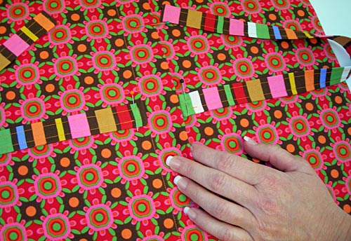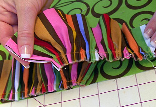- Carefully pin the extra ruffle fabric away from the corners so they do not get caught up in the stitching.