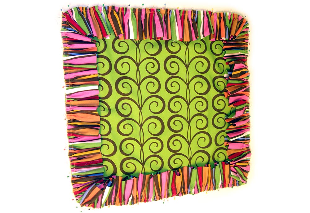 - After hemming, pin the ruffle back on the front of the pillow, overlapping the two finished ends. Pin securely.