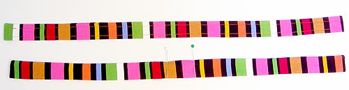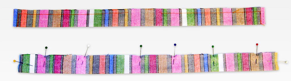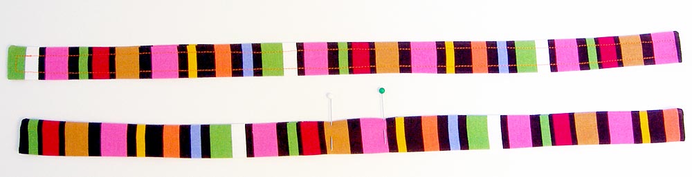 - Fold each piece in half (1¼” x 18″). Pin in place, leaving an approximate 2″ opening in the middle for turning right side out.