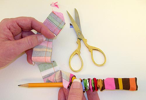 - Turn right side out, using a pencil or chop stitch to help. Clip the corners diagonally. Be careful not to clip into your seam.