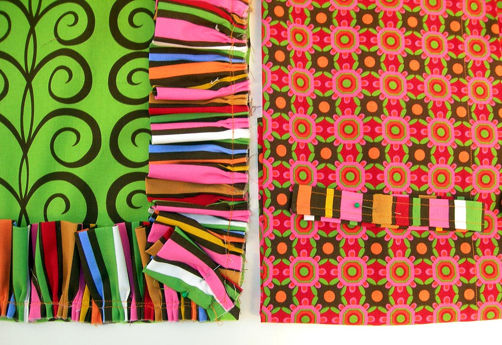 - Place your finish back/tie piece on top, right side facing down. Your ruffle and ties are sandwiched in between the layers.