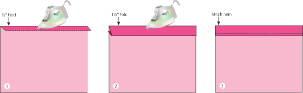 - Hem one end of ruffle. To do this, turn one end under ¼” and press, turn under again ¼” and press, then sew in place close to the folded edge.