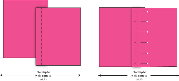 - Take both pieces and overlap the hems to yield the correct finished width (24″, 20″ or 18″ sides in our samples). Pin hems together.