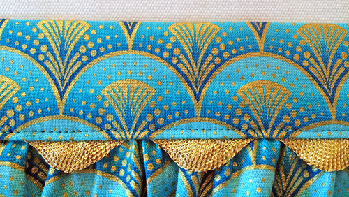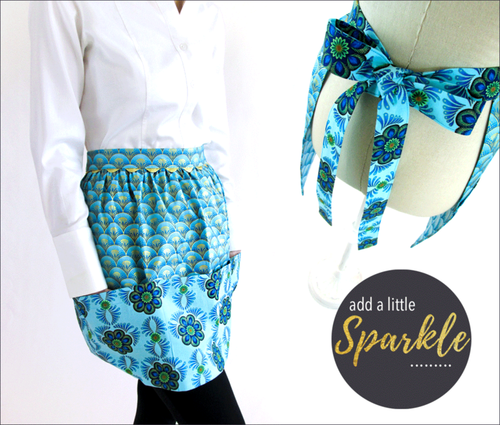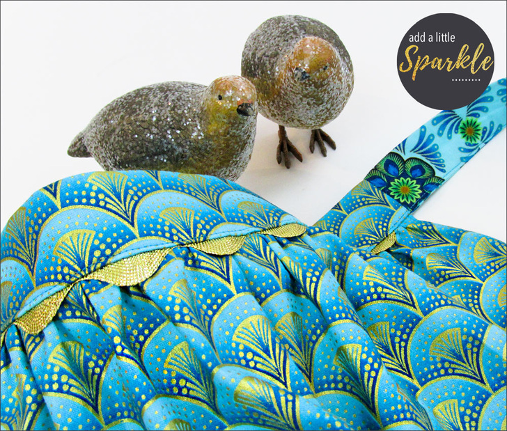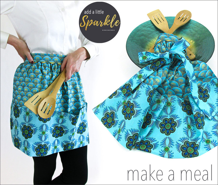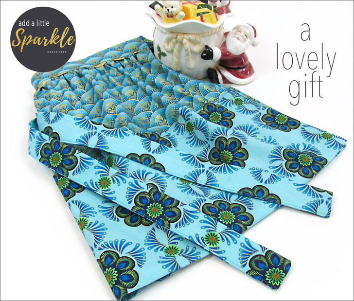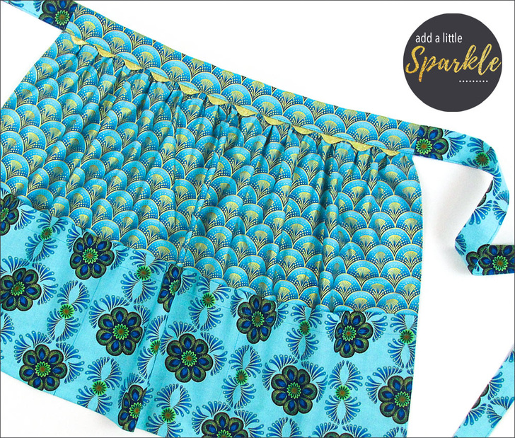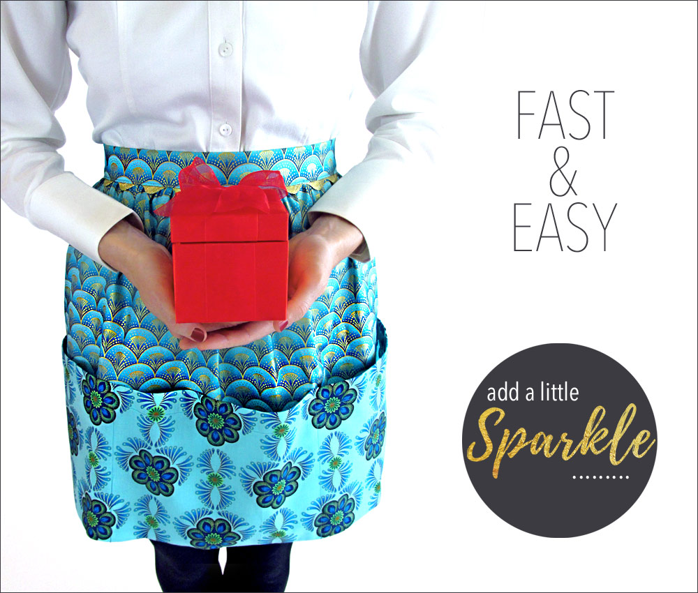 This lovely apron can get you started on your holiday sewing. We originally selected a pair of quilting cottons with lovely gold metallic accents from the Rhapsody in Blue collection from Kanvas Fabrics. It’s a festive combination that’s perfect for a holiday gathering. But who couldn’t use a bit of sparkle to glamorize an everyday occasion?! Metallic cottons are now turning up year ’round in fabric collections.