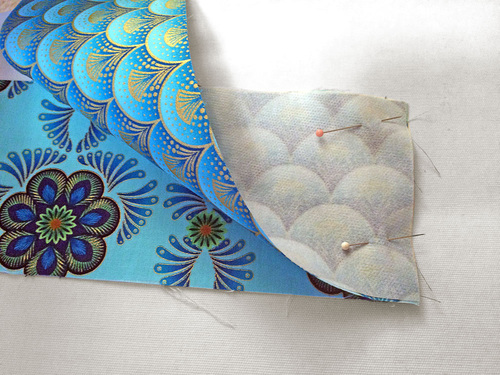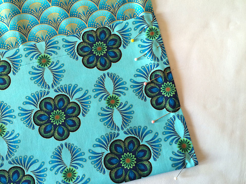 NOTE: Yes, the two panels are right side to wrong side – a little different than the traditional right sides together. It’s okay, the pocket will fold up into place so it finishes in the correct manner. - Pin the two layers together along the bottom raw edge.