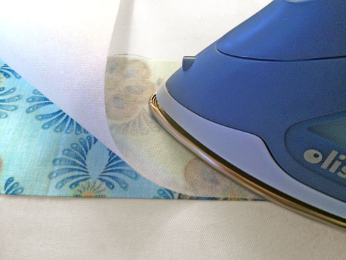 - Find the waistband strip, the two tie strips, and the three strips of matching interfacing. Following manufacturer’s instructions, fuse an interfacing strip to the back of each fabric strip.
