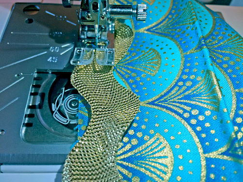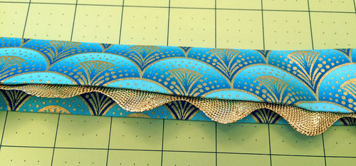 NOTE: Getting a full yard allows you to cut the interfacing for the ties vertically at 31” as full strips. If you cut horizontally in sections to butt together, you could get away with ⅝ yard. - ⅝ yard of wide rick rack; we used 1” gold metallic rick rack purchased locally – you actually need just a ½ yard cut (18”) but we recommend getting ⅝ yard to insure you can center the waves of the rick rack evenly across the front of the waistband
