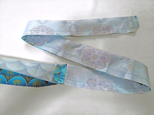 - Fold this strip in half, right sides together (so it is now 2″ x 79″). Pin in place from each vertical waistband seam out to the end of each tie. The middle 18″ waistband section should be left un-pinned.