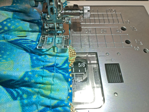 - Using a ½” seam allowance stitch the gathered apron panel to just that one layer of the waistband. It’s easiest to work with the gathers on top so you can make sure they stay in position.