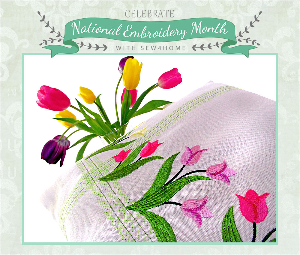 February is National Grapefruit Month as well as National Wild Bird Feeding Month. Both worthy celebrations, but we’re most interested in it also being National Embroidery Month! To celebrate we have a set of five free machine embroidery designs from Sew4Home sewist team member (and digitizing designer extraordinaire), Michele Mishler. In the midst of winter rain, snow, and ice, these lovely custom tulip designs will bring the freshness of spring to your next machine embroidery project. We also show you the steps for creating the Michele’s Tulip Garden Pillow shown above.