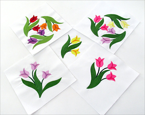 Click HERE to download the Tulip Garden Embroidery Collection available in SIX major embroidery formats. Also included on the download page are: a folder containing a .jpg image of each of the designs in color (each image represents a 6½” square and all the images are to scale with one another), a complete Color Chart for the five designs, and a template for the Tulip Garden Pillow design arrangement.