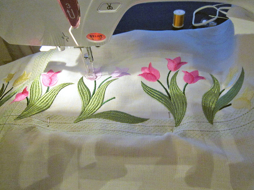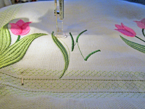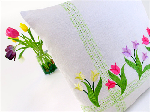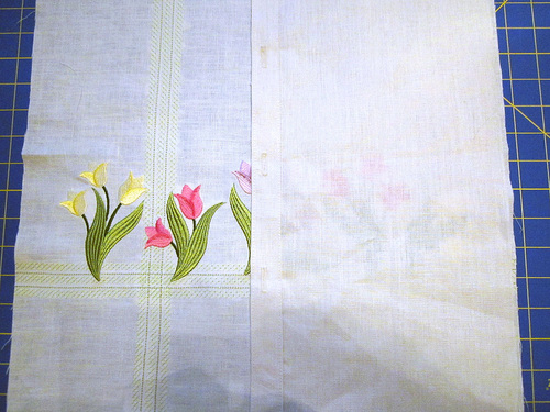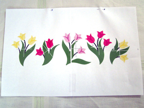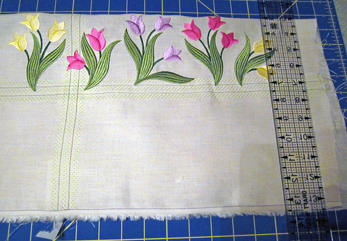- Remove the excess stabilizer. Place the pillow front on a flat work area. Position the template over the decorative stitches so the lower edge of the row of tulips is centered on the band of decorative stitches. Mark the placement crosshairs for each design. Notice that the crosshairs are all perpendicular to the decorative stitches, except for one tulip design.