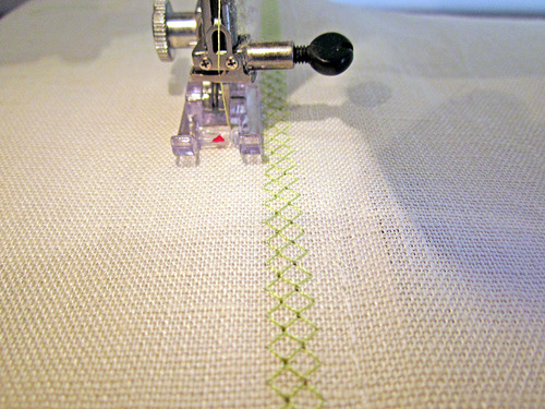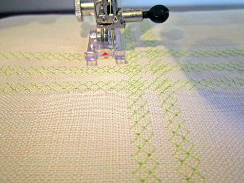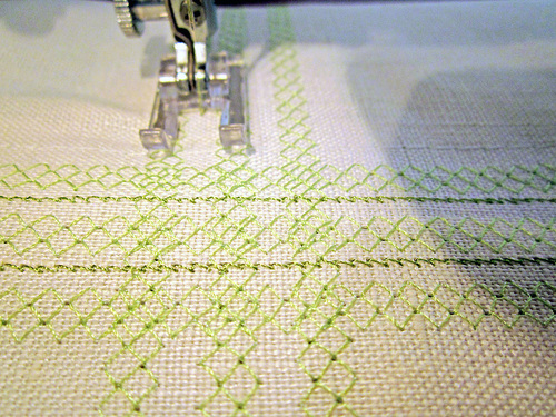 - Change the upper thread to Leaf Green, and select a stretch stitch or small zig zag. Add two lines of stitching between the rows of honeycomb stitching within both the horizontal and vertical sets.