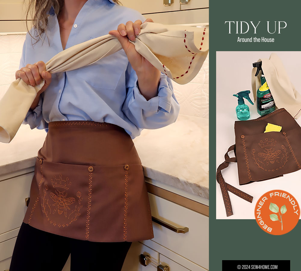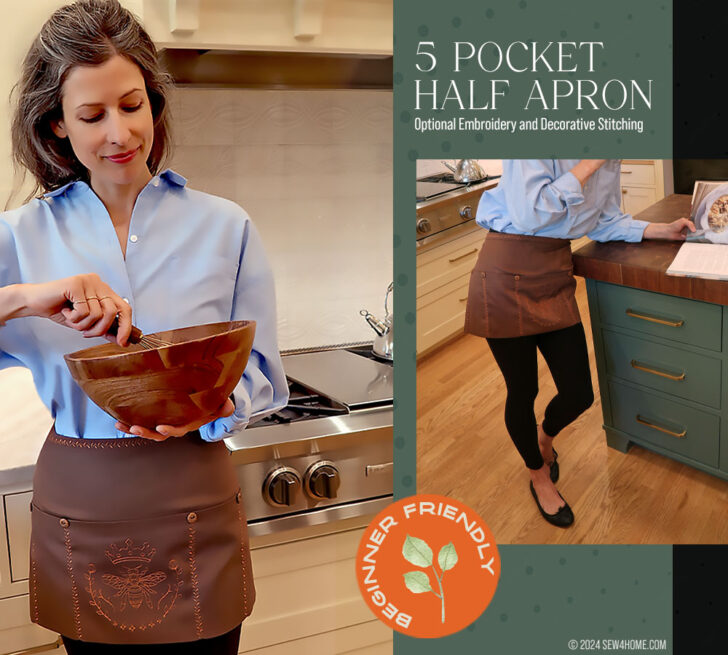 Our thanks to Janome America for sponsoring this apron project. We used the sewing and embroidery Skyline S9 for our sample construction, but depending on whether or not you opt to add all the decorative options, it’s a project that could easily be done on any model… with the caveat that anytime you’re working with thick seams and dense hems, you need a machine that can handle the heavy stuff. We’re proud to be a Janome exclusive studio because it means we don’t worry about fabric feeding challenges. Janome machines are known throughout the industry for their power and precision. We detail all our presser foot and stitch setting choices below.