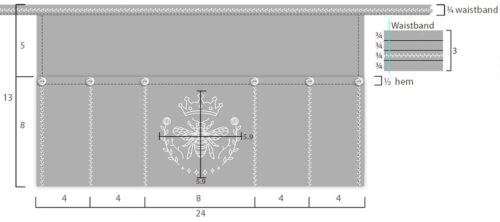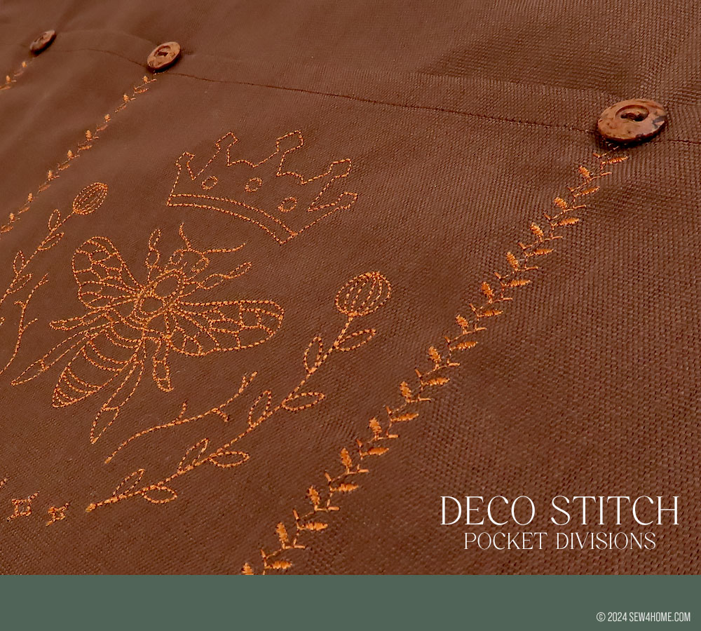 The decorative stitching is a standard design (#30 on the Janome Skyline S9). It echoed the frame of our Queen Bee embroidery. When choosing a decorative stitch design, you want a narrower finish that will fit within the ¾” waistband as well as along each of the pocket divisions. Our thread was a 40wt rayon. As always, don’t forget to test your stitch options first to make sure you love the look before you dive into your project.