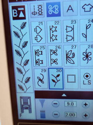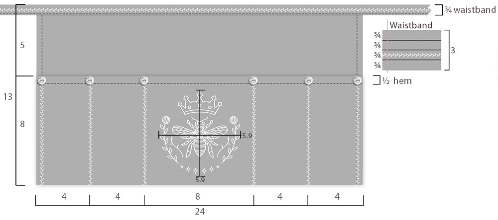 NOTE: As mentioned within the introduction above, when choosing a decorative stitch design, you want a narrower finish that will fit within the ¾” waistband as well as along each of the pocket divisions. In addition, remember thicker fabrics can sometimes require a slightly denser stitch pattern in order to really show up well. We selected Decorative Stitch #30 on the Janome Skyline S9, which fit all our criteria and was a good match to the details on the Queen Bee embroidery. We used a full 9mm stitch width.