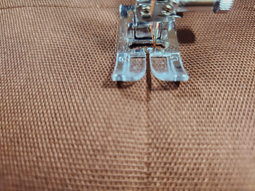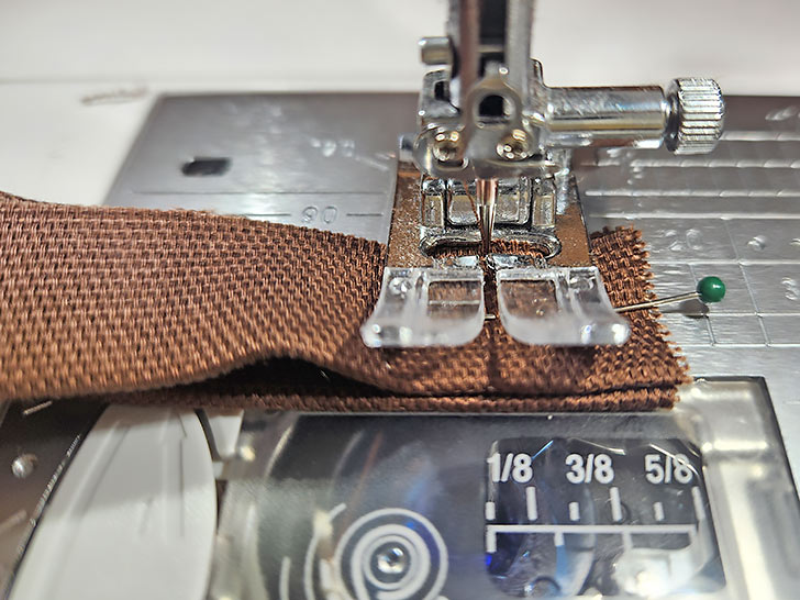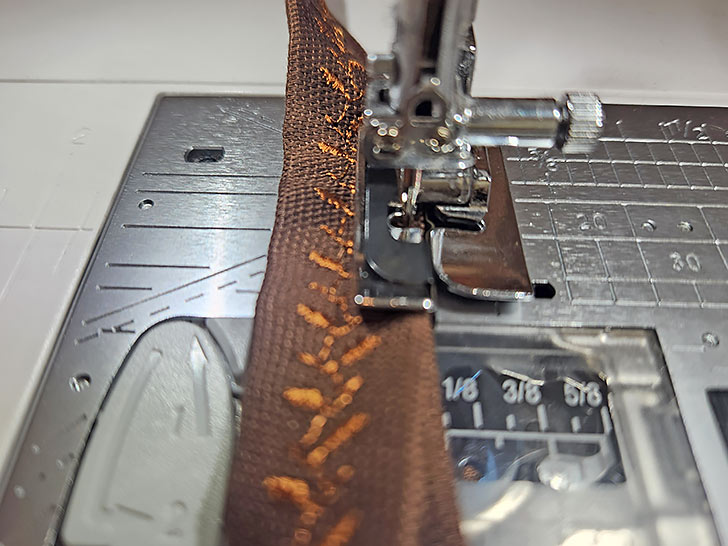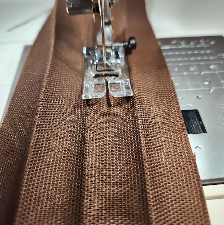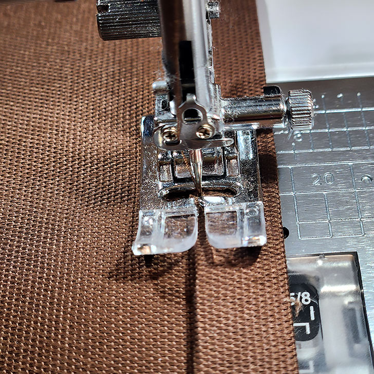 - With the strip right side up, stitch within the third “channel,” just to the right of the center crease line. As above with the hem, you are centering your stitching within this channel.