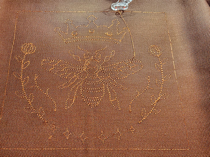 - 40wt polyester embroidery thread for machine embroidery and decorative stitching – it should coordinate with but stand out against the fabric; we used Sulky 40wt Rayon in Copper