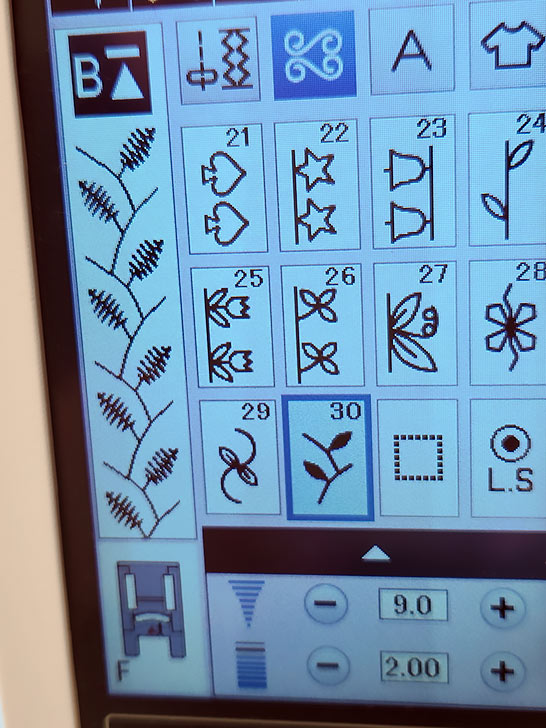 NOTE: As mentioned above, we used our standard presser foot for all decorative stitching. For an even wider view, either the regular Satin Stitch foot or the Open Toe Satin Stitch foot would be a good alternative. - Select a decorative stitch.