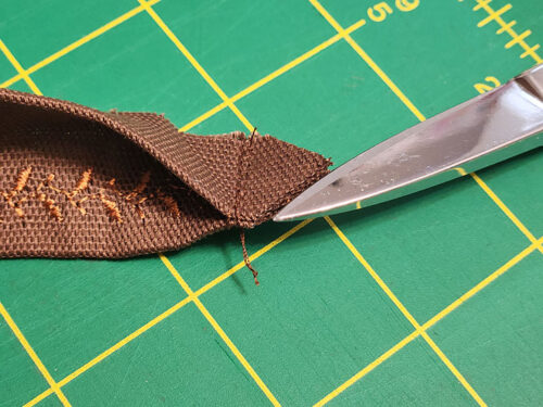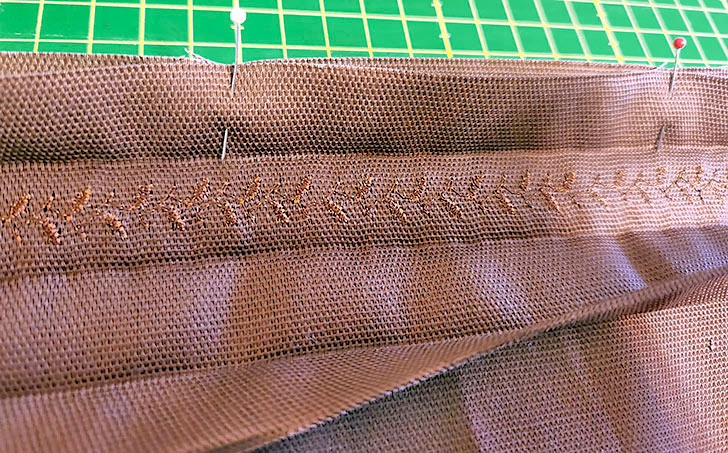- Stitch all the way across the main panel, through both layers, running the seam right along the upper crease line. You are stitching side-hem-to-side-hem across the panel.