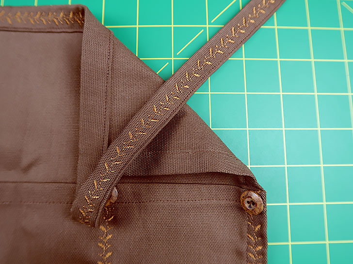 The pocket top accents are another choice you get to make: follow our sample with pretty buttons or substitute rivets. As a hardworking half apron, we do recommend some type of support along the pocket top. It’s the main stress point when reaching in and out as you go about your chores, and it deserves some extra reinforcement.