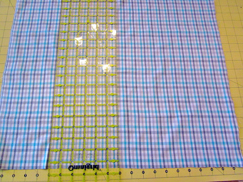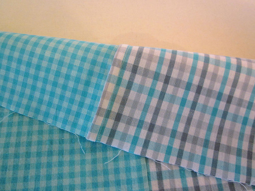 - Find the fat quarter for the two outside skirt panels (Plaid in Grey/Aqua in our sample). Cut it in half so each half now measures approximately 10½” x 18″.