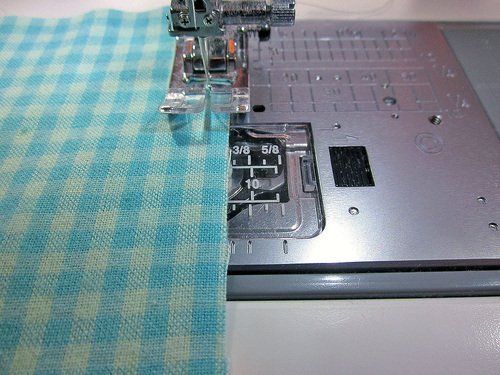 - Run a gathering stitch along the top of the skirt. To do this, stitch one or two lines of machine basting within th ½” seam allowance. Do not lock the beginning or end of the seam.