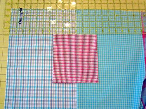 - Square each fat quarter by tugging on the the opposite corners. Then press to hold the shape. When cutting, using the lines of fabric’s motif can help you keep a straight line.
