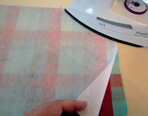 - Following manufacturer’s instructions, fuse the interfacing to the wrong side of the bib front.