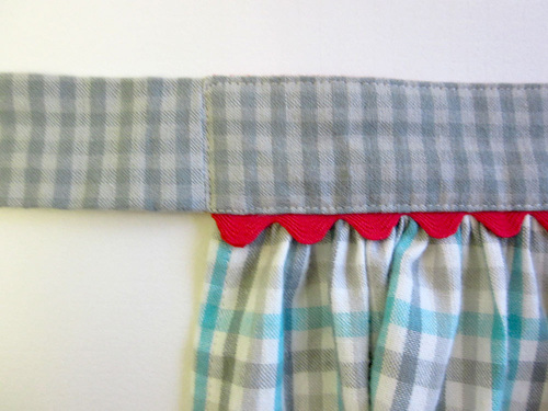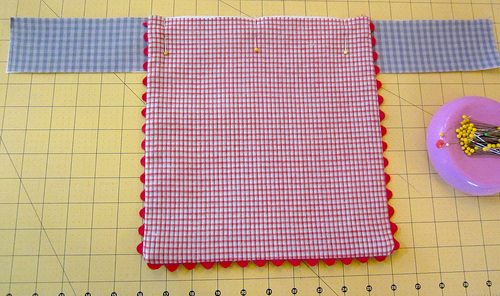 - Pin the remaining length of rick rack across the lower raw edge of the front waistband piece. As above, the rick rack should be centered on the ½” seam line.