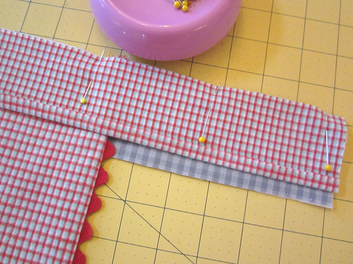 - Place the apron bib right side down on the waistband, centering the bib side to side on the waistband. Pin in place.
