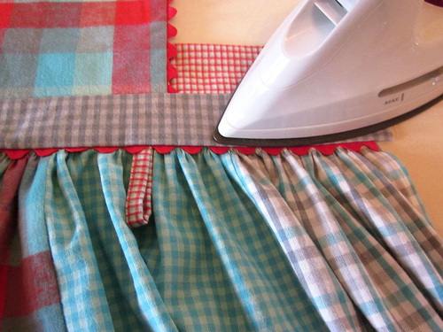 - Fold the waistband and bib up into position and press well, pressing the seam allowance up toward the waistband. Your rick rack and loop now show along the bottom edge.
