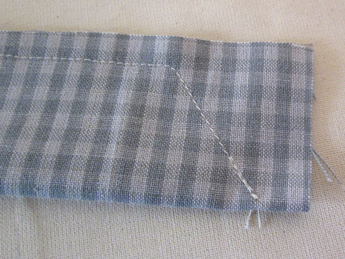 - Using a ¼” seam allowance, create a 45˚ angle on both ends as you did with the waist tie above. Pivot and stitch along the side, remembering to lock your seam at either side of the 3″ opening.