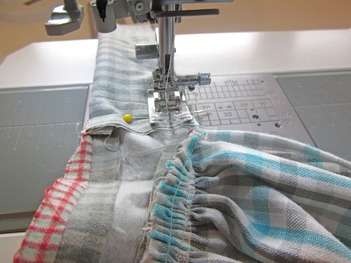 NOTE: If you are new to gathering, take a look at our tutorial: How to Make Gathers by Machine. - Pull the row(s) of machine basting to gather the skirt to approximately 20″. Adjust the gathers so they fall evenly.