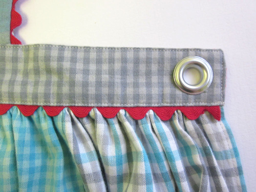 - Place the loop on top of the stitched-in-place rick rack. The raw ends of the folded loop should be flush with the raw bottom edge of the waistband. We placed ours just inside the right edge of the apron bib. Hand or machine baste the loop in place within the seam allowance.