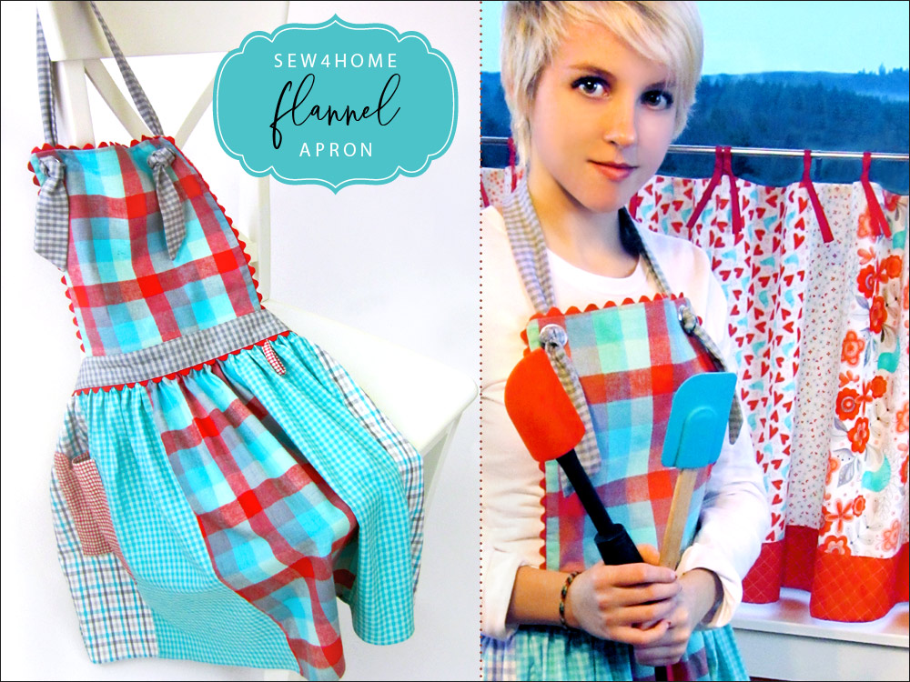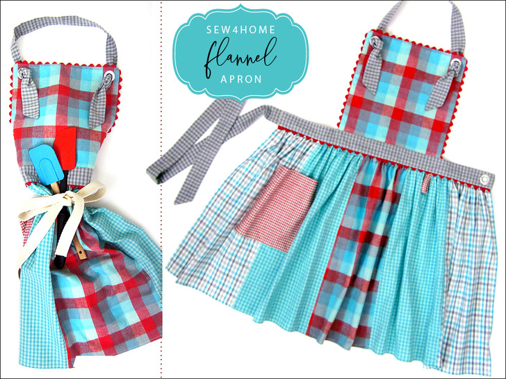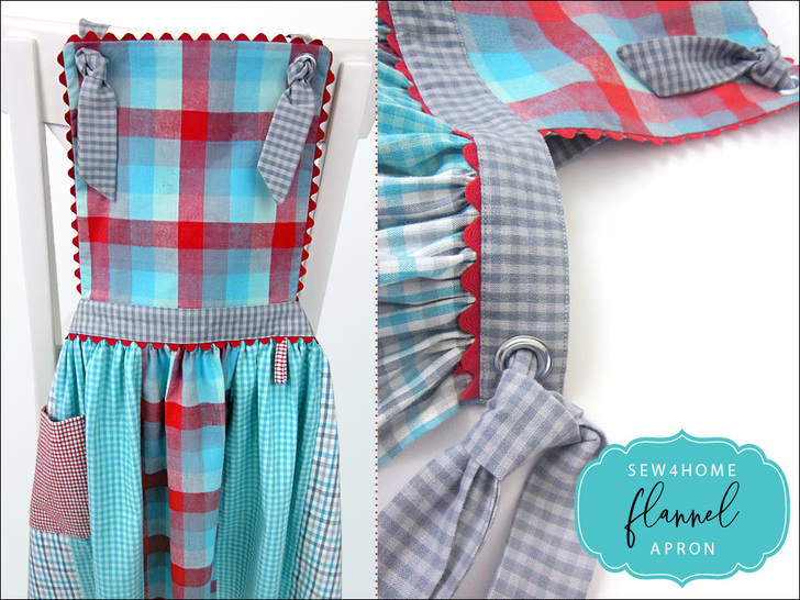 An apron in flannel makes for some cozy cookin’! We created our original sample from fat quarters, which is certainly still an option – either in flannel or crisp cotton. But, since flannel can be a bit more difficult to find in pre-cut bundles, our supply list below also specifies standard yardage cuts. The apron’s ties adjust with grommets and knots to fit a variety of sizes. And rick rack around the bib and along the waistband is the perfect finishing touch.
