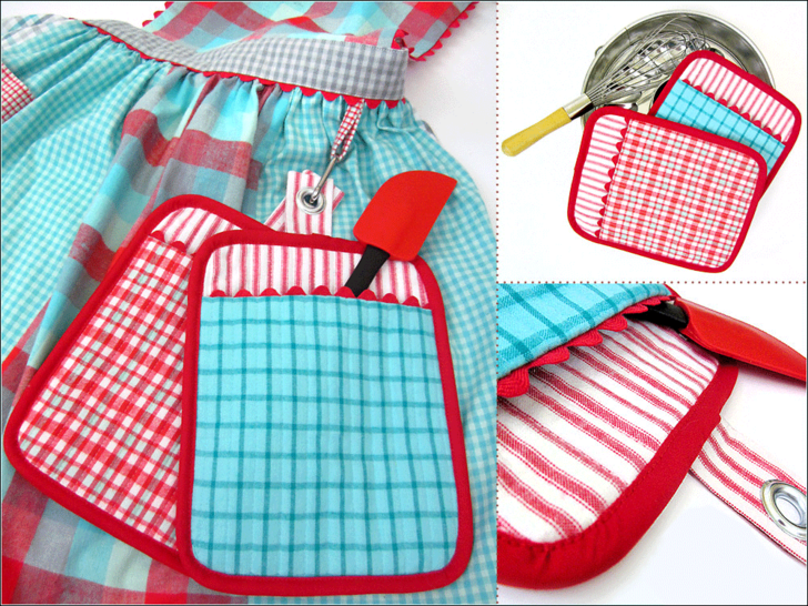 All the ties feature an easy, wrap-cinch-and-knot style utilizing metal eyelets, so adjustment for the best fit is very flexible. We also added a hanging loop along the waistband for clipping a hot pad or hand towel. In fact, we created a matching set of hot pads; bundle them together with the apron for a great gift idea.