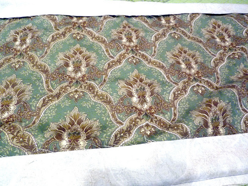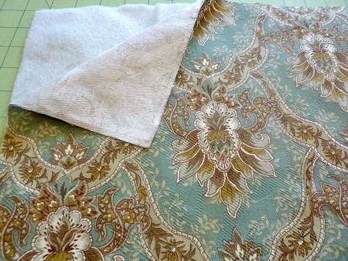 - Place one fabric/batting/piping panel right side up on your work surface.