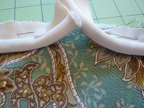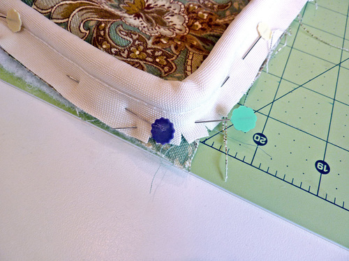 - As above, you are working right sides together, aligning the raw edges, matching the corners with the seams of the side ring, and sandwiching the piping in between the layers.