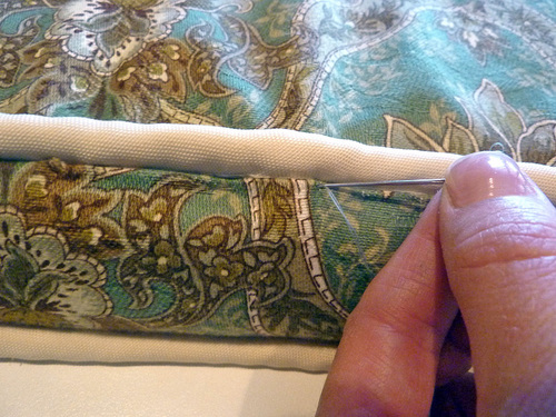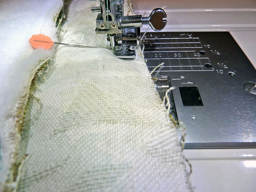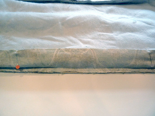- Pin the opening closed, being careful to fold in the raw edge so it is flush with the previously sewn seam.