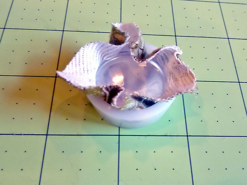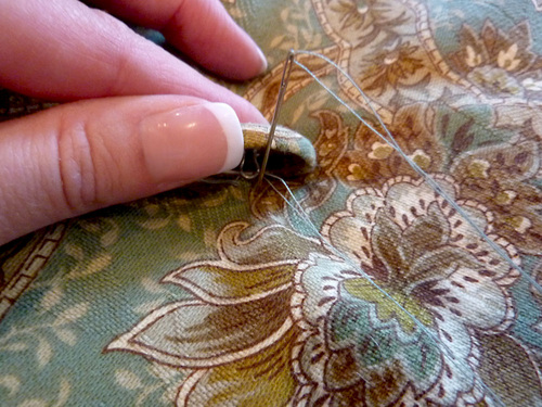 - Using the marks you made above, stitch the covered buttons in place. You are not stitching all the way through the NU-Foam®; that would make the cushion too wavy and uncomfortable to sit on. However, you are pulling the buttons tight enough to make them sink down a bit into the foam. As mentioned in the supply list, consider using buttontwist thread, which is heavier and thicker so you can pull your stitches nice and tight without snapping the thread.