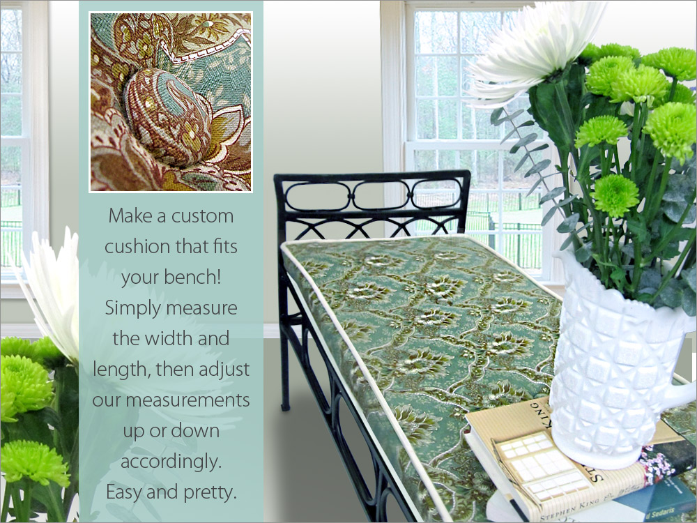 Our cushion was made to fit a 18″ x 48″ wrought iron bench and finishes at approximately 2″ thick. This is a pretty standard size, but remember, the beauty of this project is to make a custom cushion that fits YOUR bench! Simply measure the width and length, then adjust our measurements up or down accordingly.